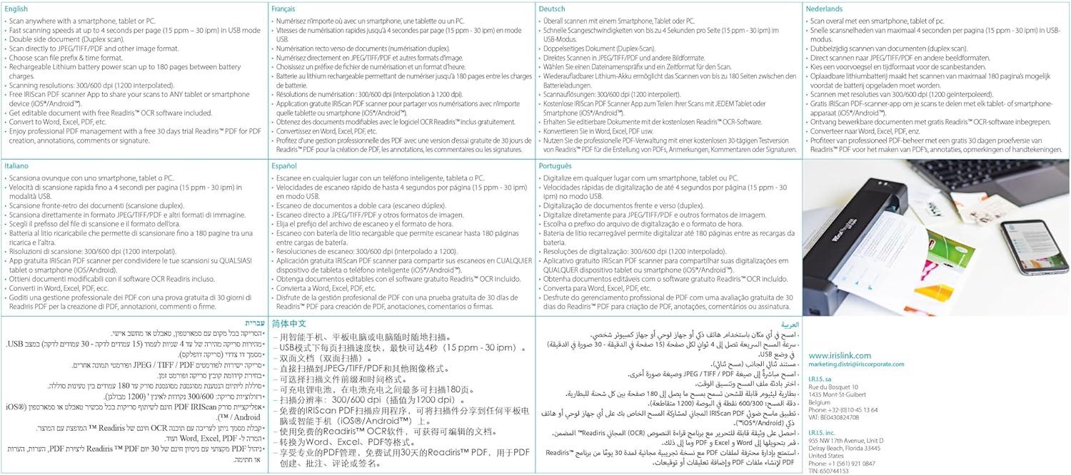 IRIScan mini scanner : additional features include scanning business cards directly to Outlook, photo scanning, and receipt scanning for efficient document management
