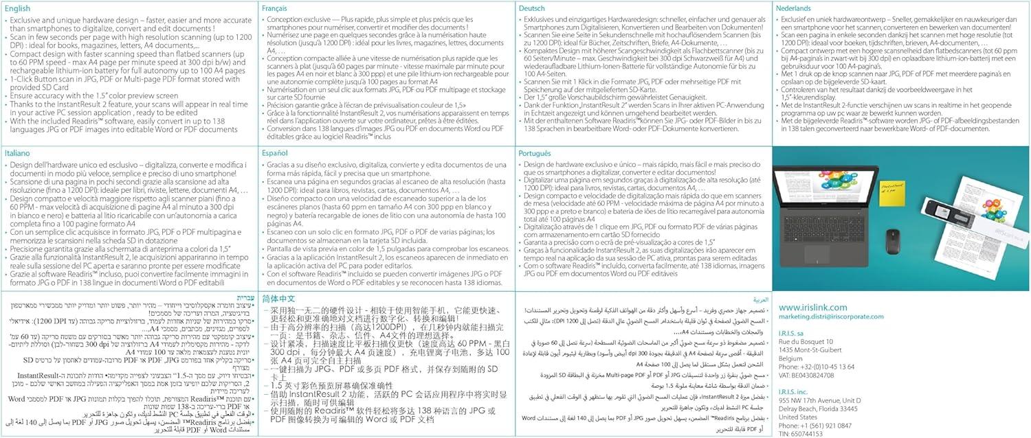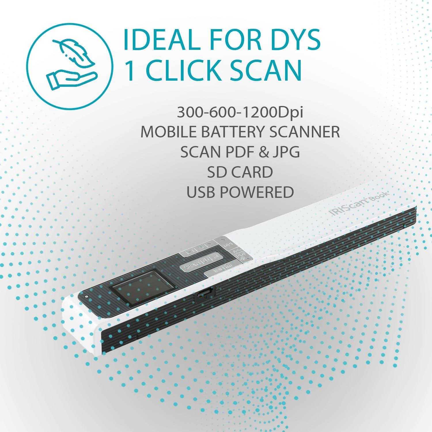 IRIScan Book portable scanner wireless battery – v5: Compact and handheld mobile scanner that allows you to scan documents on the go with ease. Battery (rechargeable) mobile scanner. SD card provided with adapter. USB powered. USB Cable provided. AC Adapter not provided. Elected Best Handheld Scanner : EDITOR Choice by PCMAG USA pcmag.com/reviews/iriscan-book-5-wifi