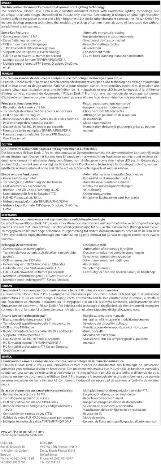 IRIScan The brand-new IRIScan Desk 7 Pro 18MP is an innovative document camera with asymmetric lighting technology, plus an unique short-arm design. Streamlined to include only essential functionality, it features an ultra-high-resolution camera with 18MP output and a high-brightness LED. Unlike other document cameras, the IRIScan Desk 7Pro features desktop cropping technology that enables the pick-up of content materials up to A3 landscape size without an additional black scan mat